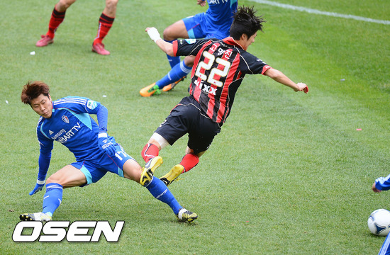 4일 오후 서울월드컵경기장에서 열린 '현대오일뱅크 K리그 2012' FC 서울과 수원 삼성의 경기, 전반 수원 박태웅이 서울 고명진의 돌파를 태크로 막아내고 있다.