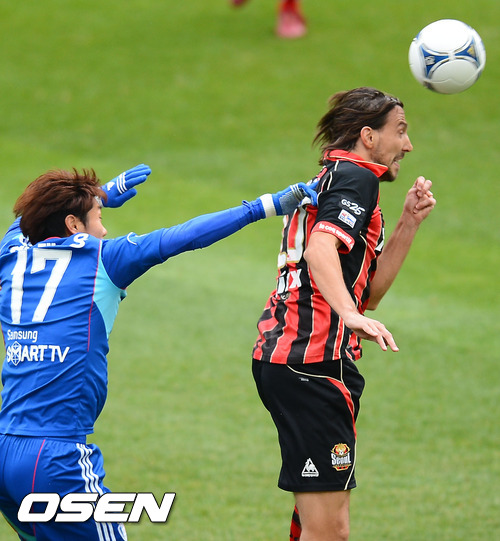 4일 오후 서울월드컵경기장에서 열린 '현대오일뱅크 K리그 2012' FC 서울과 수원 삼성의 경기, 전반 서울 데얀이 수원 박태웅 보다 먼저 공중볼을 헤딩하고 있다.