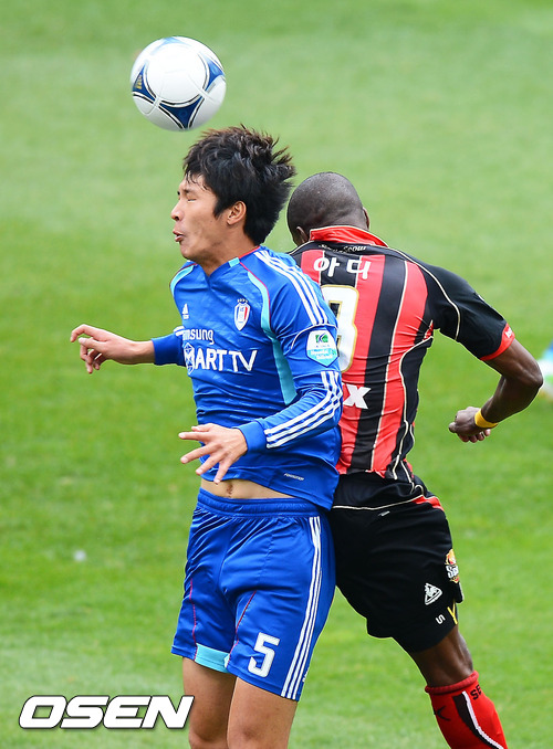 4일 오후 서울월드컵경기장에서 열린 '현대오일뱅크 K리그 2012' FC 서울과 수원 삼성의 경기, 전반 수원 박현범과 서울 아디가 공중볼 다툼을 하고 있다.