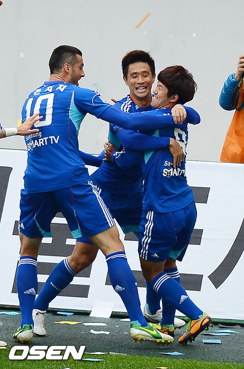 4일 오후 서울월드컵경기장에서 열린 '현대오일뱅크 K리그 2012' FC 서울과 수원 삼성의 경기, 전반 수원 이상호(오른쪽)가 선제골을 성공시킨 후 동료들과 기쁨을 나누고 있다.