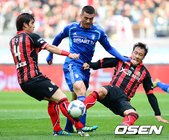 4일 오후 서울월드컵경기장에서 열린 '현대오일뱅크 K리그 2012' FC 서울과 수원 삼성의 경기 전반 라돈치치의 문전돌파가 서울 수비에 막히고 있다.