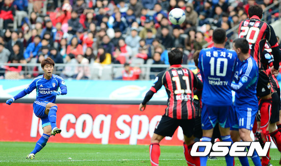 4일 오후 서울월드컵경기장에서 열린 '현대오일뱅크 K리그 2012' FC 서울과 수원 삼성의 경기 전반 박태웅이 프리킥을 차고 있다.