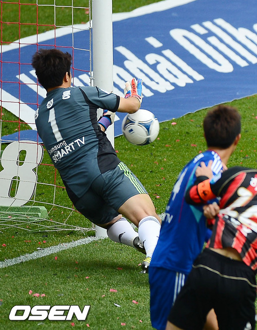 4일 오후 서울월드컵경기장에서 열린 '현대오일뱅크 K리그 2012' FC 서울과 수원 삼성의 경기, 전반 수원 정성룡이 서울 몰리나의 슛을 막아내고 있다.