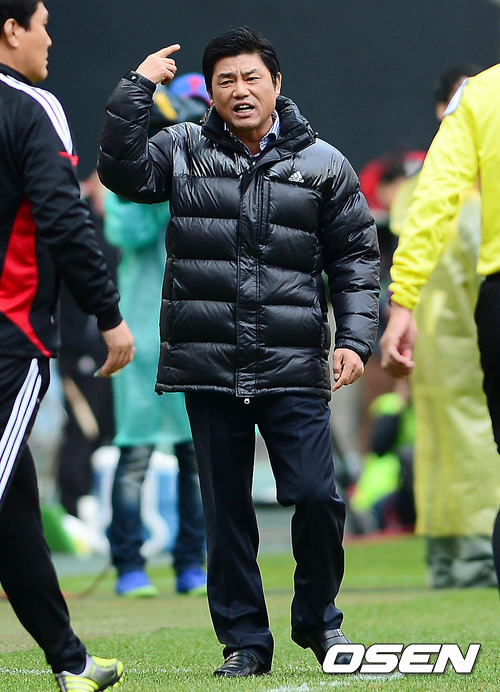 4일 오후 서울월드컵경기장에서 열린 '현대오일뱅크 K리그 2012' FC 서울과 수원 삼성의 경기 전반 몰리나의 태클에 심판이 휘슬을 안 불자 윤성효 감독이 항의하고 있다.