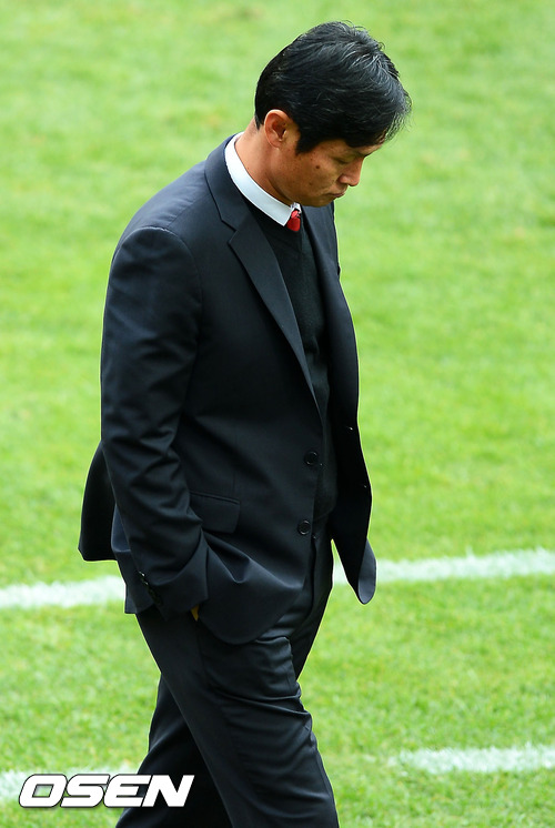 4일 오후 서울월드컵경기장에서 열린 '현대오일뱅크 K리그 2012' FC 서울과 수원 삼성의 경기, 전반 서울 최용수 감독이 지시를 내린 후 고개를 숙인채 벤치로 들어가고 있다.