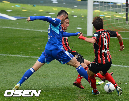 4일 오후 서울월드컵경기장에서 열린 '현대오일뱅크 K리그 2012' FC 서울과 수원 삼성의 경기, 전반 수원 라돈치치가 슛을 시도하고 있다.