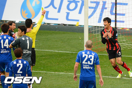 4일 오후 서울월드컵경기장에서 열린 '현대오일뱅크 K리그 2012' FC 서울과 수원 삼성의 경기, 후반 서울 정조국이 수원 문전에서 공격자 반칙으로 옐로우 카드를 받고 있다.