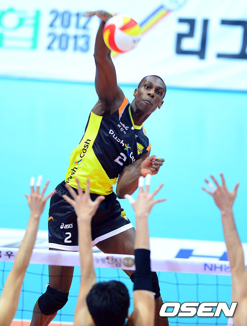 4일 오후 인천 도원시립체육관에서 열린 '2012-2013 NH농협 V리그' 남자부 인천 대한항공과 아산 러시앤캐시의 경기, 1세트 러시앤캐시 다미가 강타를 날리고 있다