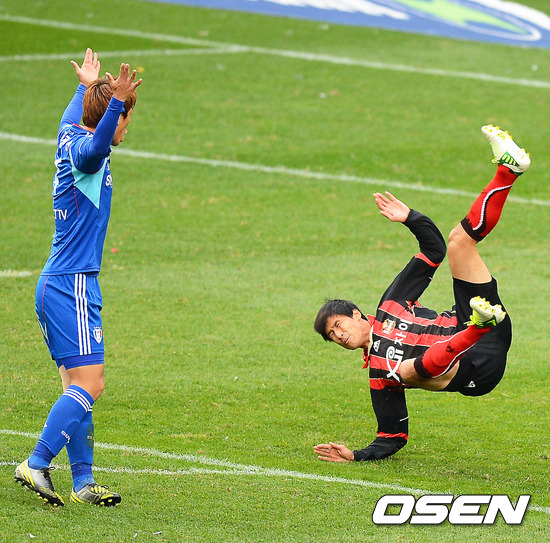 4일 오후 서울월드컵경기장에서 열린 '현대오일뱅크 K리그 2012' FC 서울과 수원 삼성의 경기, 후반 서울 정조국이 골라인 안에서 돌파하던 도중 반칙을 범하며 넘어지고 있다.