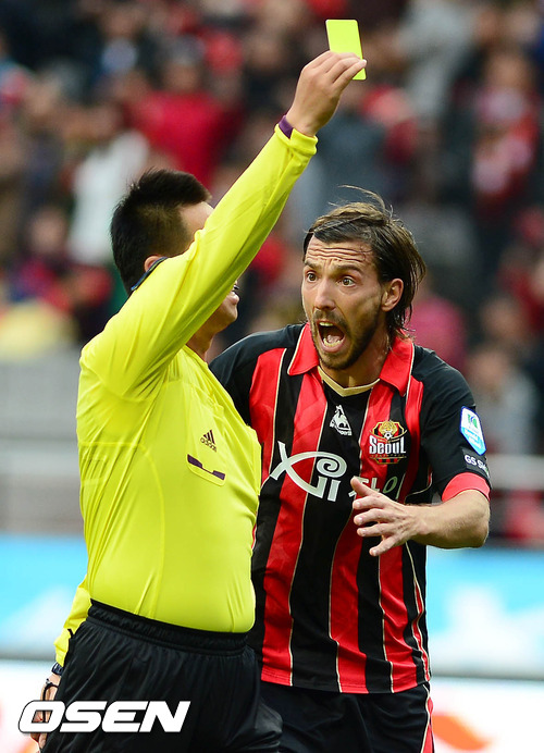 4일 오후 서울월드컵경기장에서 열린 '현대오일뱅크 K리그 2012' FC 서울과 수원 삼성의 경기 후반 정조국이 경고를 받자 데얀이 놀란 펴정을 짓고 있다.