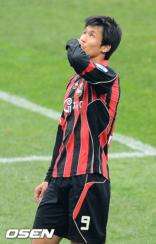 4일 오후 서울월드컵경기장에서 열린 '현대오일뱅크 K리그 2012' FC 서울과 수원 삼성의 경기, 후반 서울 정조국이 동점골에 성공한 후 반지키스세레머니를 하고 있다.