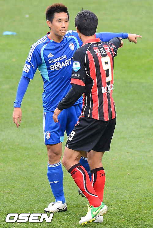 경기를 마치고 서울 정조국이 수원 오범석이 정조국의 동점골 상황에 대해 오프사이드의 여부에 대해 얘기를 나누고 있다. / rumi@osen.co.kr