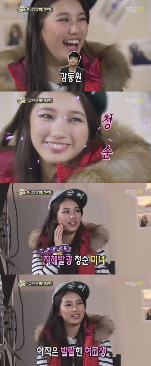 또한 수지는 이날 방송에서 청순, 섹시, 귀여움 중에 어떤 찬사가 좋냐는 리포터의 물음에 “청순. 나는 긴 머리와 하얀 피부를 갖고 있으니까”라고 귀엽게 대답했다.