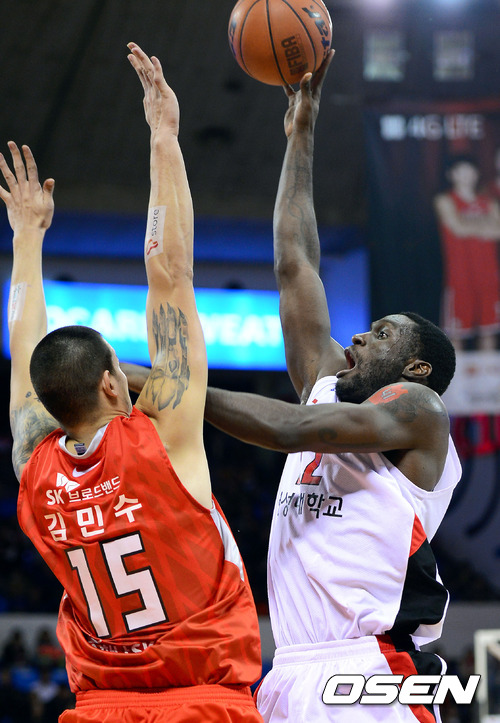 4일 오후 잠실학생체육관에서 열린 'KB 국민카드 2012-2013 프로농구' 서울 SK 나이츠와 안양 KGC의 경기 3쿼터 KGC 파틸로가 SK 김민수를 앞에두고 훅슛을 시도하고 있다.