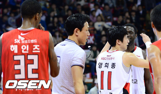 4일 오후 잠실학생체육관에서 열린 'KB 국민카드 2012-2013 프로농구' 서울 SK 나이츠와 안양 KGC의 경기 3쿼터 KGC 파틸로와 SK 헤인즈가 말다툼을 하자 양희종이 파틸로를 진정시키고 있다.