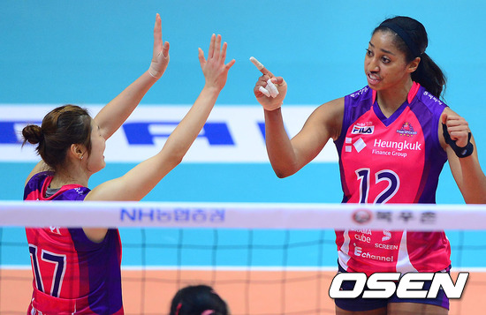 4일 오후 인천 도원시립체육관에서 열린 '2012-2013 NH농협 V리그' 여자부 흥국생명과 기업은행의 경기, 2세트 휘트니가 강타 성공후 이진화와 하이파이브를 하고 있다.