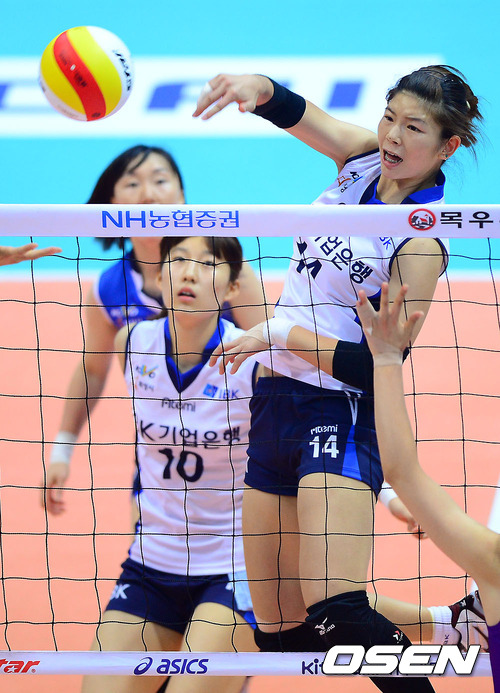 4일 오후 인천 도원시립체육관에서 열린 '2012-2013 NH농협 V리그' 여자부 흥국생명과 기업은행의 경기, 2세트 기업은행 유희옥이 연타를 날리고 있다