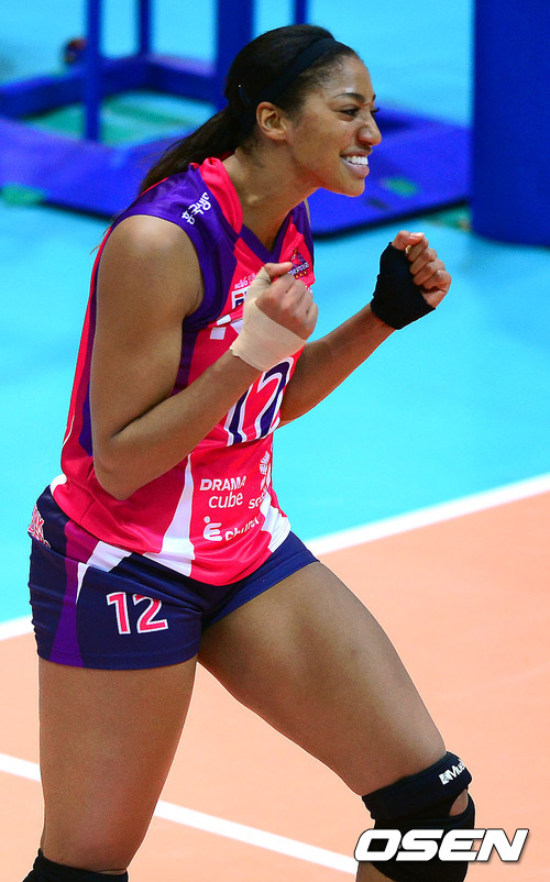 4일 오후 인천 도원시립체육관에서 열린 '2012-2013 NH농협 V리그' 여자부 흥국생명과 기업은행의 경기, 4세트 흥국생명 휘트니가 주먹을 쥐며 환호하고 있다