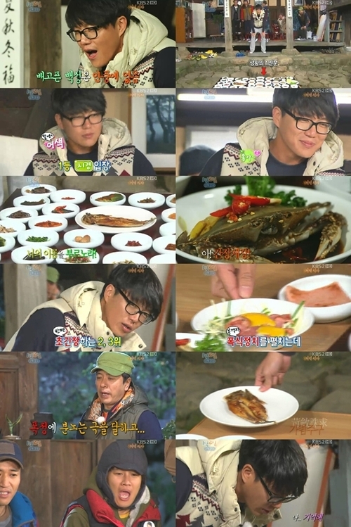 그런 성시경이 지난주 복불복 마라톤대회에서 1등을 했고, 그 결과로 이날 한정돼 있는 49첩 반상에 있는 반찬을 가장 먼저 담을 수 있었다. 성시경은 지난 기차에서의 설움을 밥상을 채우는 것으로 씻어내려는 듯 맛있는 반찬을 모두 자신의 밥상에 담아 웃음을 자아냈다.