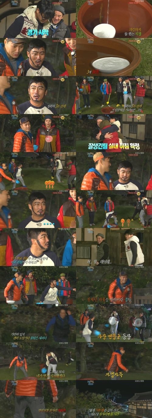 이날 멤버들은 잠자리 복불복을 위해 잘 생긴 팀과 못 생긴 팀으로 나눠 여러 대결을 펼쳤다. 마지막 게임은 대야에 담긴 그릇에 물을 담는 것으로 침몰할 경우 야외취침이 확정됐다. 못생긴 팀 이수근, 김종민, 주원은 결국 이 그릇을 침몰시켰고, 잘생긴 팀 엄태웅, 성시경, 차태현은 서로를 얼싸안고 좋아하기 시작했다.