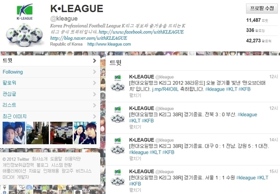연맹은 "K리그는 실시간 정보교류와 쌍방향 소통에 맞춰 트위터 서비스를 운영 중"이라며 "특히 최근에는 선수와 팬, 구단과 팬이 활발하게 이야기를 주고받으며 일상의 재미있는 소식이 오가는 등 축구팬에게 또 다른 재미를 전하고 있다. 계속해서 K리그 팬 확보로 이어지기를 기대한다"고 밝혔다.