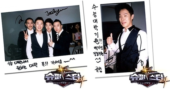 '슈퍼스타K4' 공식트위터는 5일 오전 유승우, 김정환, 안예슬, 허니지, 연규성의 수능 대박 기원 메시지와 함께 그들의 폴라로이드 사진을 공개했다.