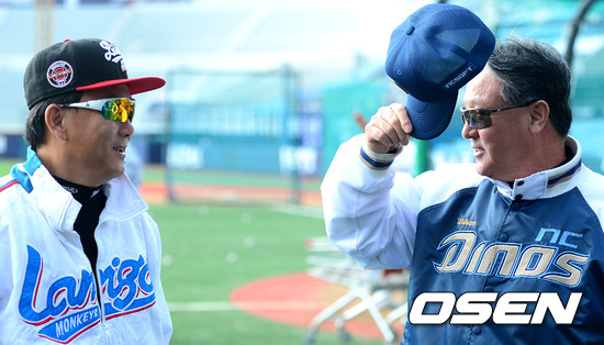 라미고 홍이중 감독과 NC 김경문 감독이 인사를 나누고 있다.