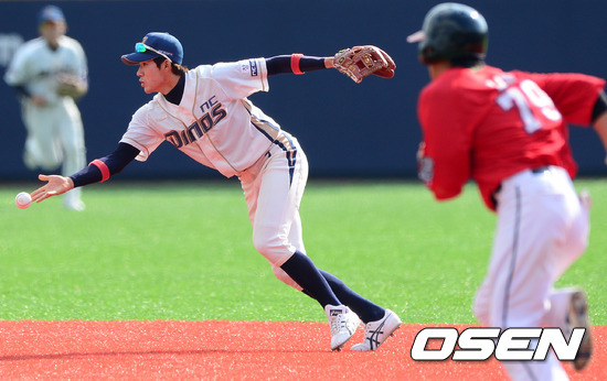 1회초1사 1루에서 NC 박민우가 라미고 천관런의 내야땅볼을 잡아 2루로 토스하고 있다.