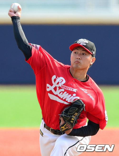 1회말 라미고 선발투수 왕펑씬이 역투하고 있다.