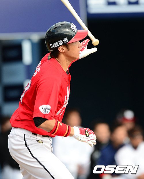 2회초2사 1,2루에서 라미고 황하오란이 1타점 적시타를 날리고 있다.