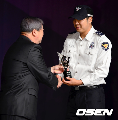 5일 오후 서울 삼성동 인터컨티넨탈 호텔에서 열린 '2012 팔도 프로야구' 패넌트레이스 최우수선수(MVP)와 최우수 신인선수 및 부문별 시상식에서 경찰청 장원준이 구본능 KBO 총재로부터 트로피를 받고 있다.