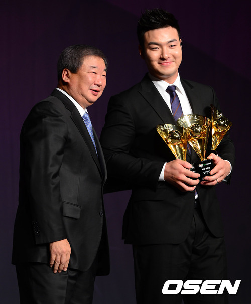 5일 오후 서울 삼성동 인터컨티넨탈 호텔에서 열린 '2012 팔도 프로야구' 패넌트레이스 최우수선수(MVP)와 최우수 신인선수 및 부문별 시상식에서 최다홈런상, 최다타점상, 최고장타율상을 수상한 넥센 박병호가 구본능 KBO 총재로부터 트로피를 받고 있다.