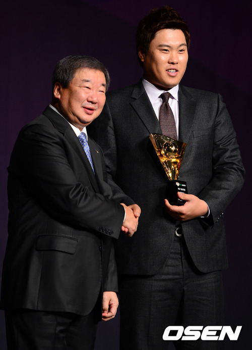 5일 오후 서울 삼성동 인터컨티넨탈 호텔에서 열린 '2012 팔도 프로야구' 패넌트레이스 최우수선수(MVP)와 최우수 신인선수 및 부문별 시상식에서 최다탈삼진상을 수상한 한화 류현진이 기념촬영을 갖고 있다.