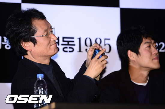 5일 오후 동대문 메가박스에서 열린 영화 '남영동 1985'(정지영 감독)언론배급시사회에서 문성근이 휴대폰으로 사진촬영을 하고 있다.