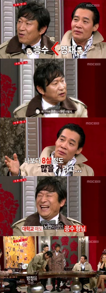 이에 다른 출연진들은 깜짝 놀라는 표정을 지으며 "형님이세요?"라고 되물었고, 이에 김응수는 "학교 선배님이시다. 학번으로 볼때 나보다 8~9살 많으시다"고 밝혀 놀라움을 자아냈다.
