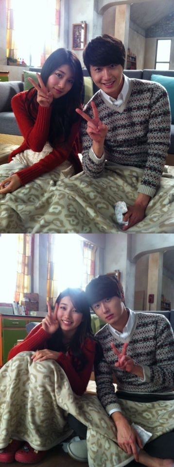 사진 속 정일우와 수지는 손으로 브이자를 그리며 나란히 앉아 다정한 모습을 연출하고 있다. 이들은 한 담요를 사이좋게 덮고 있어 마치 연인 같은 분위기를 풍긴다.