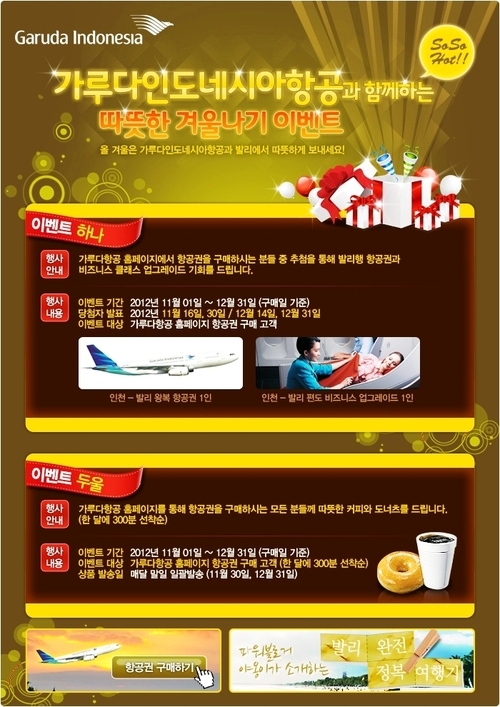 가루다인도네시아항공 홈페이지에서 항공권을 구매하면 추첨을 통해 인천-발리행 왕복 항공권과 인천-발리행 편도 비즈니스클래스 업그레이드 기회를 받을 수 있다. 행사 기간은 11월 1일부터 12월 31일까지며 당첨자 발표는 11월 16일과 30일, 12월 14일과 31일로 2주에 한 번씩 총 8명에게 혜택이 돌아간다.