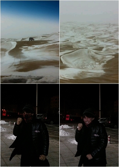 사진 속 김장훈은 두터운 패딩과 털모자로 완전 무장한 상태이지만 추위를 감출 수 없는 듯 몸이 움츠러들었다. 그럼에도 파이팅 넘치는 표정으로 웃고 있어 중국사막화방지프로젝트를 위한 그의 의지를 느낄 수 있었다.
