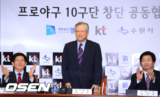 6일 오후 경기 수원 경기도청에서 열린 KT 프로야구 10구단 창단 공동협약식에서 이석재 KT회장이 인사를 하고 있다