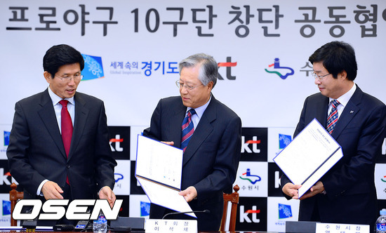 경기도와 수원시는 이날 KT와 업무협약(MOU)를 맺고 10구단 창단 지원을 약속했다.