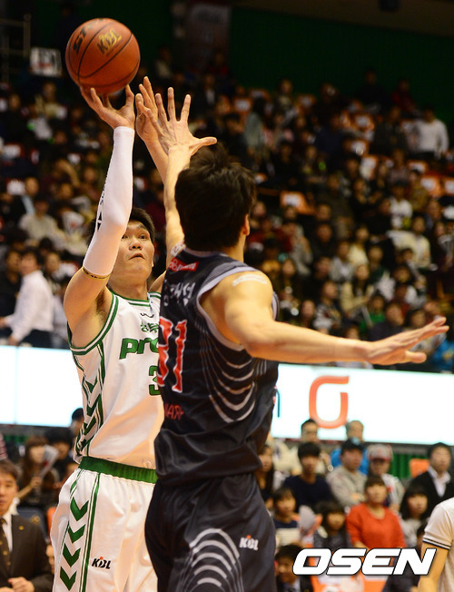 1쿼터 동부 김주성 KT 장재석의 수비를 피해 점프슛을 시도하고 있다.