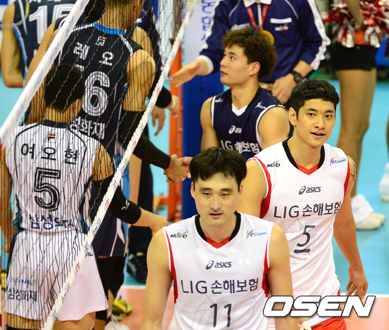 경기 종료 후 LIG 이경수와 김요한이 삼성화재 선수들과 인사를 나누고 있다. /sunday@osen.co.kr