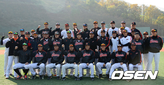 롯데 선수단 및 코칭스태프가 기념촬영을 하고 있다.