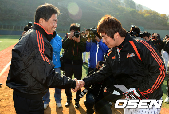 김시진 감독이 강민호와 인사를 나누고 있다.