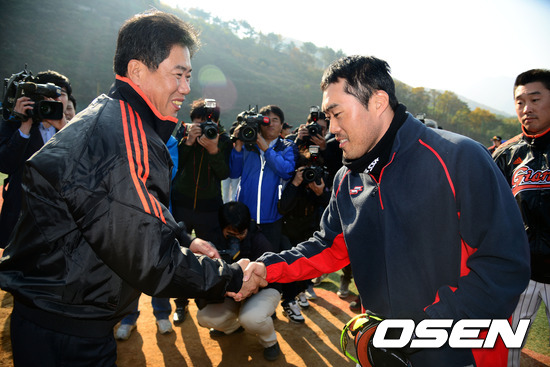 김시진 감독이 조성환과 인사를 나누고 있다.