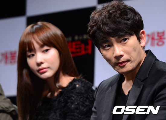 7일 오전 서울 신사동 CGV 압구정에서 열린 영화 제작보고회에서 김아중 지성이 질문이 적힌 스크린을 바라보고 있다.