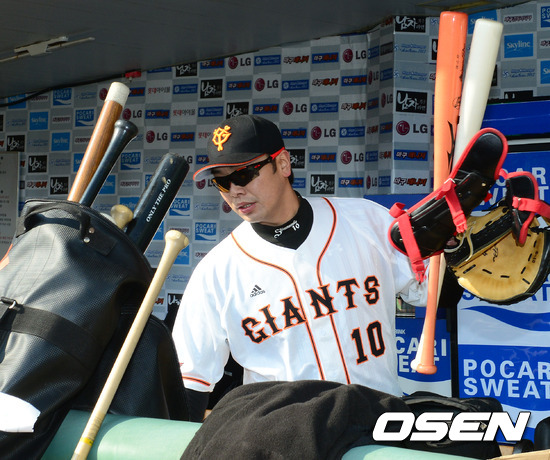 요미우리 아베 신노스케가 더그아웃에서 훈련 준비를 하고 있다.