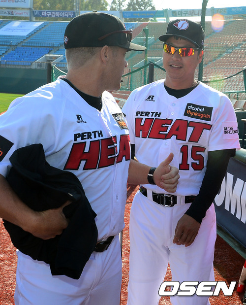 구대성이 동료 선수와 이야기를 나누고 있다. '시드니 블루삭스'에서 뛰고 있는 구대성은 아시아시리즈 기간 동안 '퍼스 히트'로 임대됐다.
