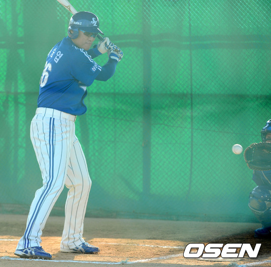 삼성 이승엽이 타석에 서 투수들의 훈련을 돕고 있다.