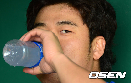 삼성 박석민이 더그아웃에서 음료를 마시고 있다.